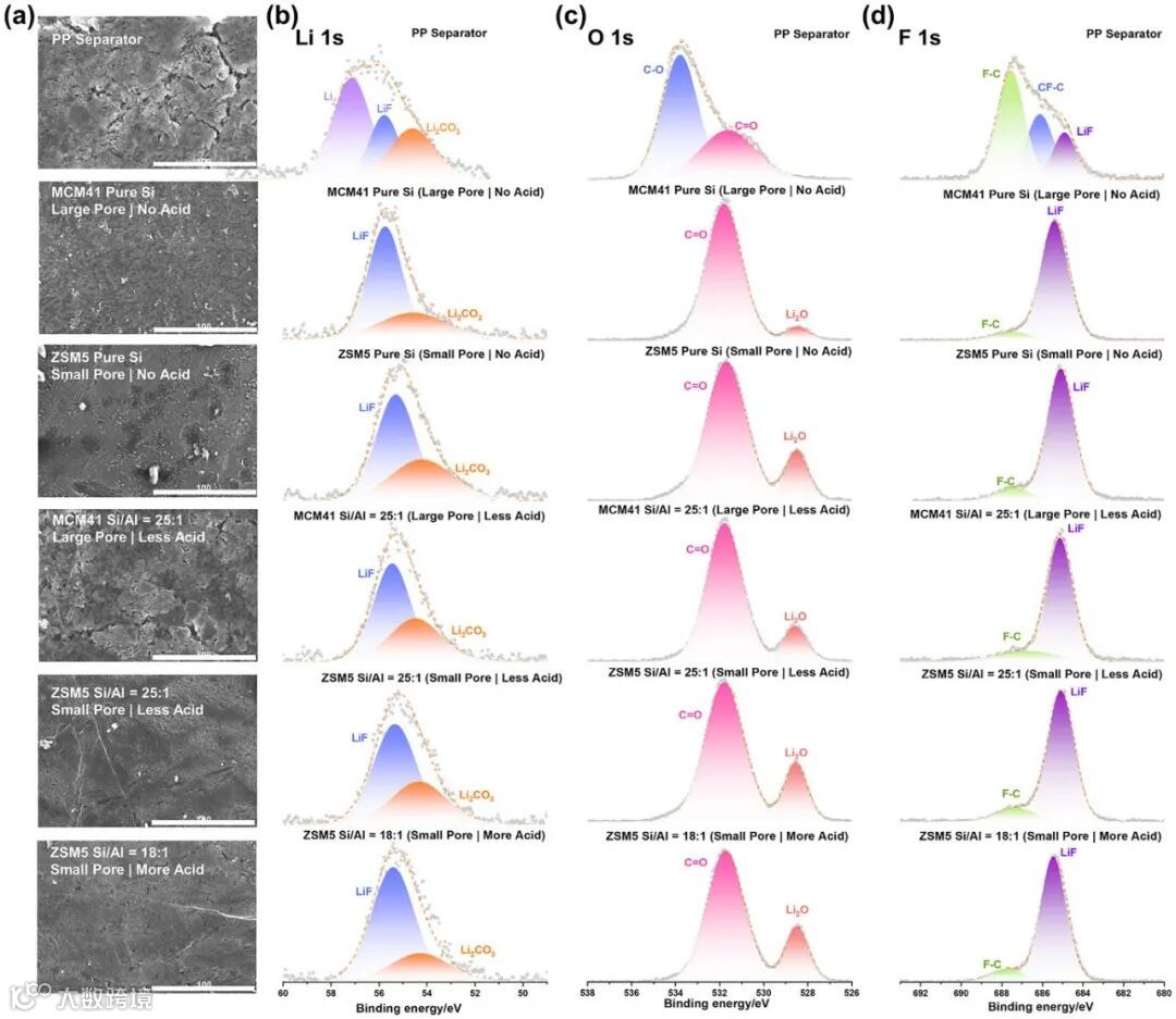通过循环后锂负极的SEM和XPS表征发现,PP隔膜电池的锂负极表面粗糙、裂纹丛生,且SEI膜中有机组分(81.48%)占主导。而经小孔/高酸性分子筛隔膜调控的锂负极,表面异常光滑致密,无枝晶生长。更重要的是,其SEI膜中无机相(如LiF、Li₂O)的含量超过了84%,这种薄而致密的无机富集SEI膜是电池实现长寿命和高安全性的根本原因。