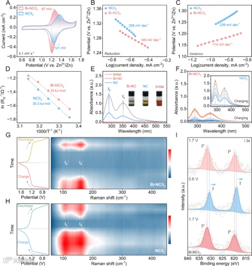 图4. 碘氧化还原反应的可逆性。(A)0.1 mV s−1 扫描速率下的CV曲线;(B-C)还原过程和氧化过程的塔菲尔斜率;(D)基于不同温度下Nyquist图计算得到的Bi-NC/I2和NC/I2的活化能(Eₐ);(E)Bi-NC 和 NC 在 I3− 溶液中浸泡24 h后的紫外-可见吸收光谱(插图为可视化吸附测试图);(F)原位紫外-可见光谱;(G-H)原位拉曼光谱;(I)Bi-NC/I2不同充放电状态下的I 3d XPS