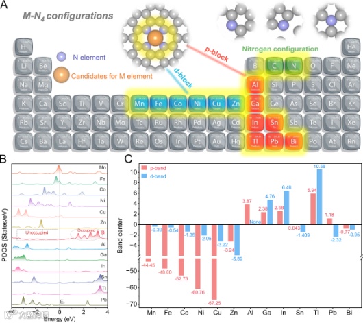图1. 理论筛选。(A)从d-区和p-区金属中筛选出13种单原子M-NC构型的候选元素(M = Mn, Fe, Co, Ni, Cu, Zn, Al, Ga, In, Sn, Tl, Pb, Bi);(B)I3−在M-NC上吸附时13种候选元素的态密度;(C)不同M-NC构型的p-带和d-带中心