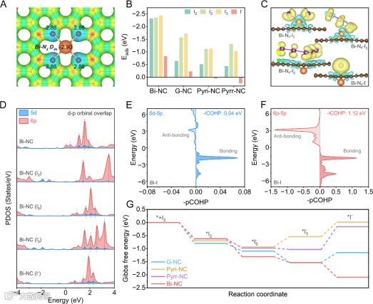 图2.DET计算。(A)Bi-NC的静电势和Bader电荷分布;(B)碘物种在不同底物上的吸附能;(C)碘物种在Bi-NC上吸附后的差分电荷;(D)原始Bi-NC及吸附不同碘物种后Bi的态密度;(E-F)Bi-I键的晶体轨道哈密顿布居;(G)吉布斯自由能变化图