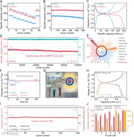 图3. NC-I2和Bi-NC-I2电极的电化学性能。(A)倍率性能;(B)0.2 A g−1电流密度下的循环性能;(C)恒流充放电曲线;(D)16 A g−1高电流密度下的长循环性能及库仑效率(E)电化学性能对比图(F)自放电时间-电位曲线;Zn/Bi-NC/I₂ 软包电池:(G)两个串联的Zn/Bi-NC/I2软包电池点亮LED灯图片;(H)恒流充放电曲线(I)5 mA cm−2的电流密度下的循环性能(J)循环性能对比图