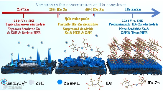 图1. IDs配合物浓度的变化及其在减轻副反应、HER和枝晶锌生长方面的作用示意图。此外,在主要以IDs-Zn为主的电解液中,IDs-Zn的低氧化还原电位有助于提升ZIFB的能量密度。从左至右,分别代表典型的ZAFBs负极液、部分富集IDs-Zn的ZAFBs负极液以及主要以IDs-Zn为主的ZAFBs负极液。