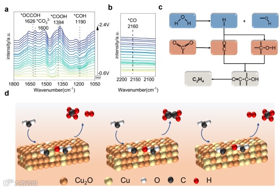 图.5(a,b)为在不同电位下测得的Cu2O-40-e原位ATR-FTIR光谱;(c)为Cu2O-40-e的CO2RR途径示意图;(d) Cu2O-23-e, Cu2O-40-e, Cu2O-175-e 的反应机理图.
