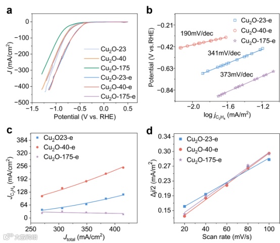 图.2.(a)六种Cu2O的线性伏安曲线; (b,c,d)分别为电化学重构后Cu2O的Tafel曲线,ECSA性能,分电流密度图。