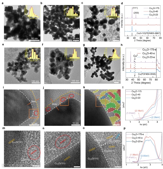图.1.(a), (b),(c)为Cu2O-23,Cu2O-40,Cu2O-175的TEM图像及相应的粒径分析图;(d)为三种电极的XRD图谱;(e,f,g) 为Cu2O-23-e,Cu2O-40-e,Cu2O-175-e的HR-TEM图像及相应的粒径分析图; (h) 为Cu2O-23-e,Cu2O-40-e,Cu2O-175-e的XRD图; (I,j,k) Cu2O-23-e,Cu2O-40-e,Cu2O-175-e的HR-TEM图像以及放大图(m,n,o), 放大图的比例尺为10nm, k图中绿色区域为Cu2O(110)晶面, 黄色区域为Cu2O(111)晶面, 蓝色区域为Cu2O(200)晶面, 红色区域为Cu(111)晶面; (l) 为Cu2O-23,Cu2O-40,Cu2O-175紫外可见光谱对应的Tauc图; (p) 为Cu2O-23-e,Cu2O-40-e,Cu2O-175-e紫外可见光谱对应的Tauc图.