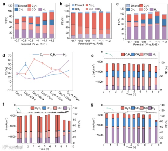 图.3. (a,b,c) 分别为Cu2O-23-e,Cu2O-40-e,Cu2O-175-e的FE;(d)七种催化剂在-1.0 V(vs RHE)下的性能对比图; (e,f,g) Cu2O-23-e,Cu2O-40-e,Cu2O-175-e的长循环.