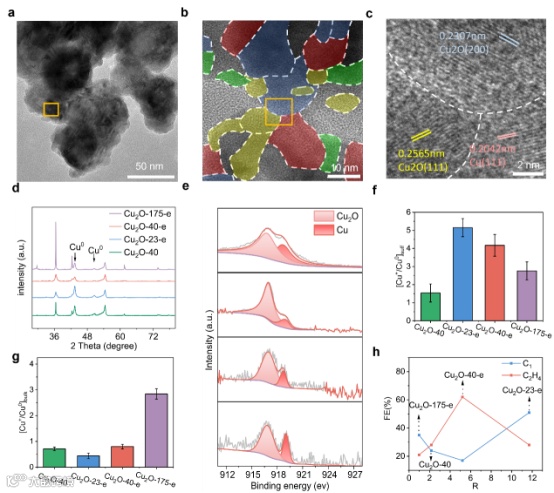 图.4. Cu2O-40-e的TEM图像(a), (b);(c)为(b)的HR-TEM图,b图各颜色所对应晶面与前文一致; (d) 电极的XRD图和对应的[Cu+/Cu0]bulk对比图(g);(e)为Cu2O-40,Cu2O-23-e, Cu2O-40-e, Cu2O-175-e的Cu LMMa和对应的(f)[Cu+/Cu0]sulf对比图; (h) R值与催化剂性能关联图.