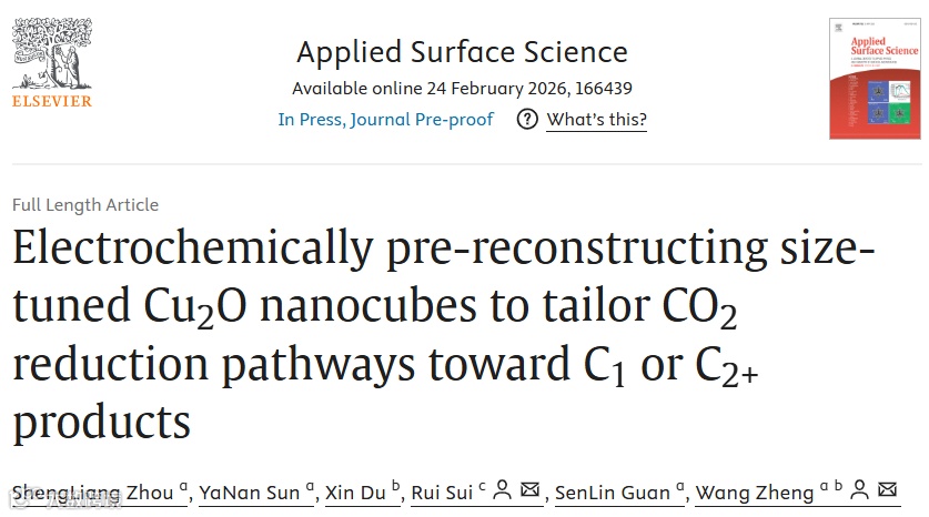 近日,来自宁夏大学的王政教授,在国际知名期刊applied surface science上发表题为“Electrochemically Pre-reconstructing Size-Tuned Cu2O Nanocubes to Tailor CO2 Reduction Pathways toward C1 or C2+ Products”的观研究成果。