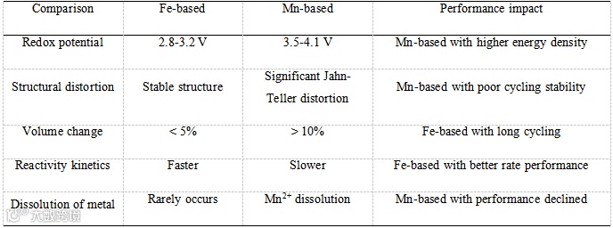 表1. Fe/Mn基聚阴离子正极各种参数对比。