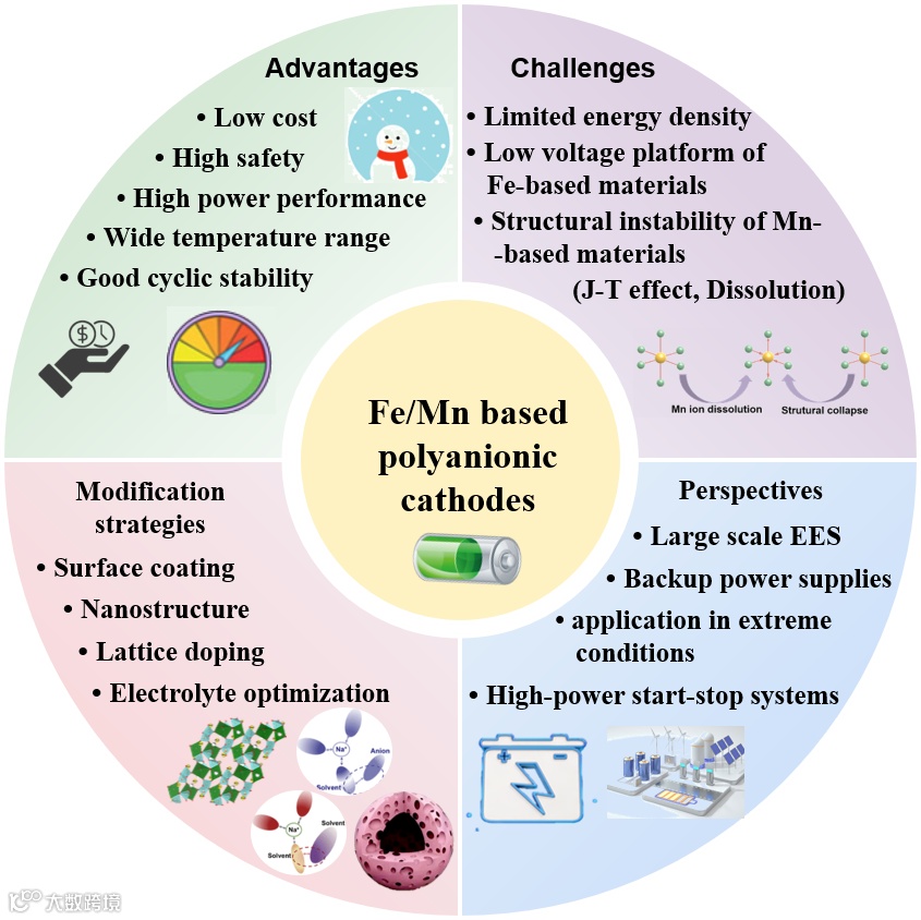 图1. Fe/Mn基聚阴离子阴极的结构优势、挑战、改性策略及未来商业前景。