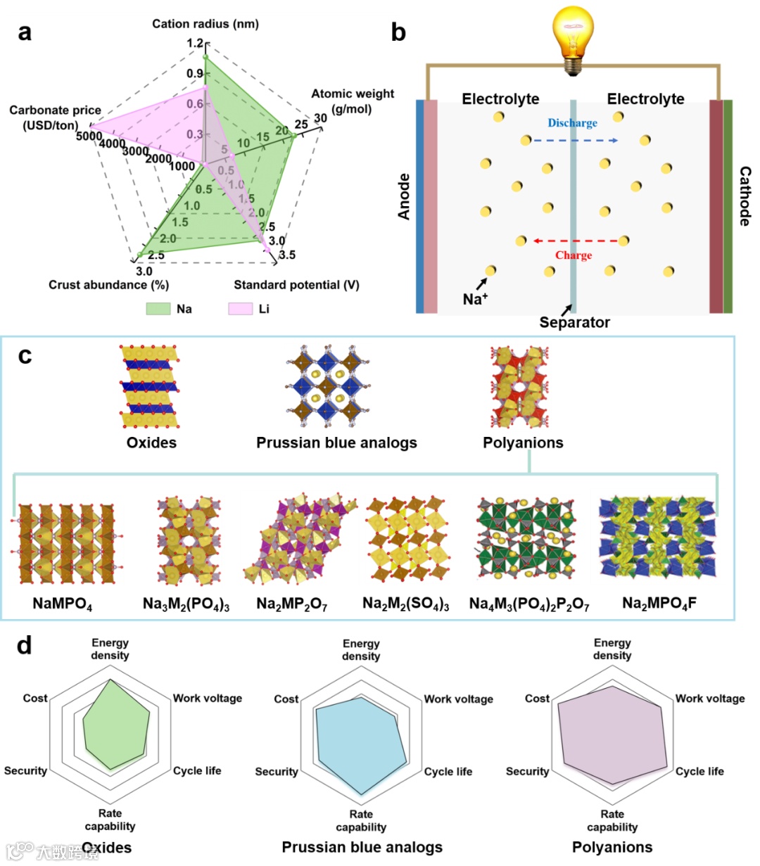 图2. 锂离子电池(LIBs)和钠离子电池(SIBs)相对特性的比较。(b)钠离子电池充放电机理示意图。(c)三种主要正极材料:金属氧化物、普鲁士蓝类似物和聚阴离子化合物。根据聚阴离子官能团进一步分为磷酸盐、焦磷酸盐、硫酸盐、混合焦磷酸盐、氟磷酸盐和氟硫酸盐。(d)氧化物、普鲁士蓝和聚阴离子的性能比较图。