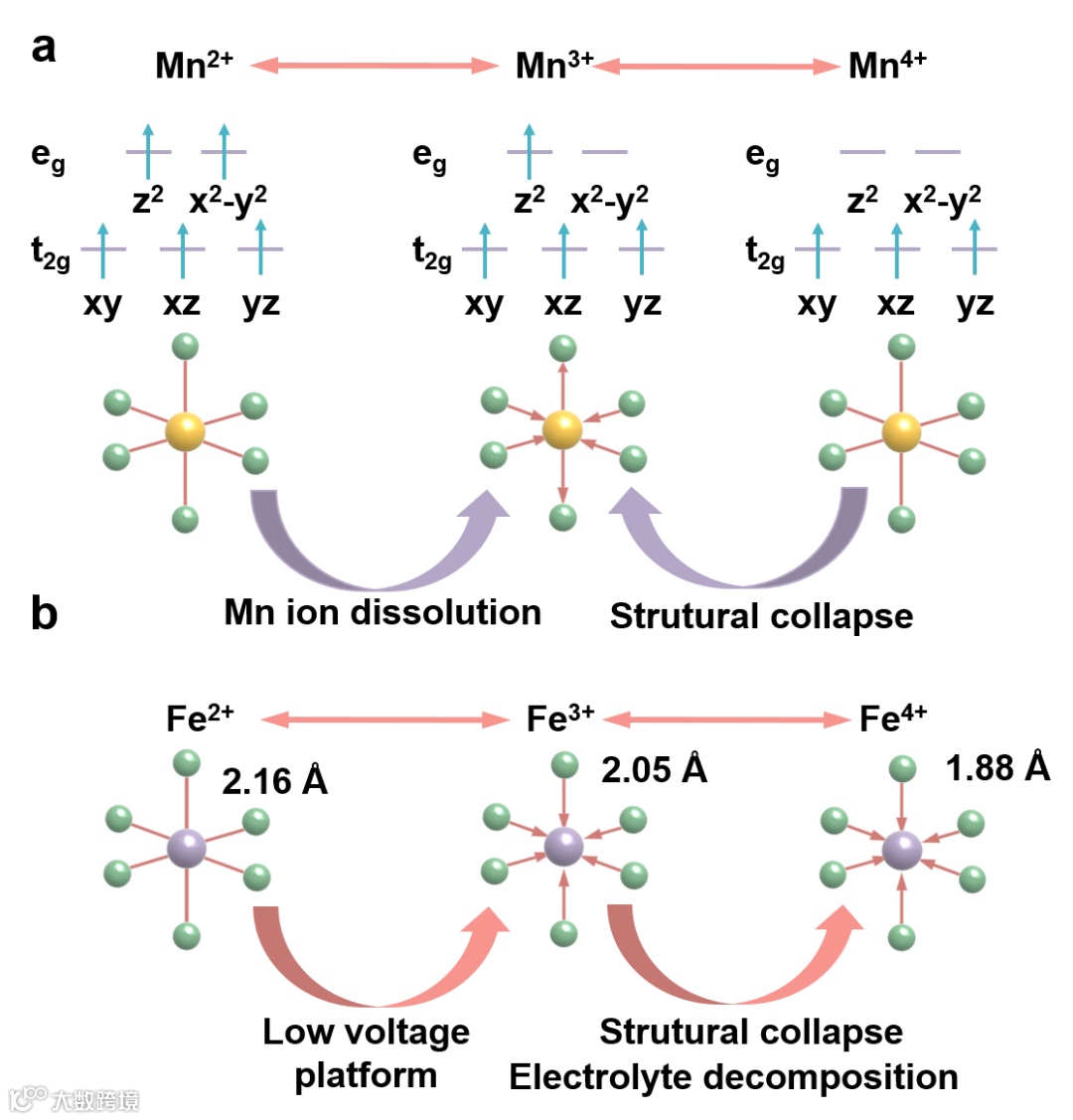 图4. (a)锰基阴离子和(b)铁基阴离子在电化学过程中面临的挑战。