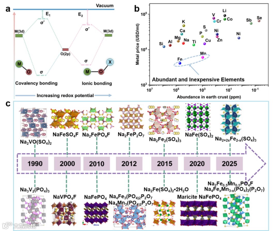 图3. 聚阴离子对聚阴离子化合物中M-O键的离子性质和键结构的影响示意图。(b)地壳中元素的丰度与价格关系图。(c) 钠离子电池中主要的聚阴离子化合物的历史发展进展。