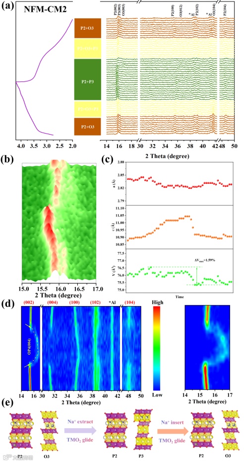 图4(a)NFM-CM2 的原位 XRD 图谱和(b)放大后的图谱。 (c)NFM-CM2 中的参数变化 (d)NFM 的原位 XRD 图谱 (e)充放电过程中结构参数的变化。