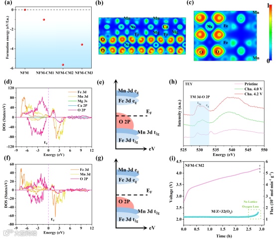 图 2. (a)样品的形成能,(b、c)NFM-CM2 和 NFM 在(010)方向的电子局域函数,(d、e)NFM-CM2 和(f、g)NFM 的态密度。(h、i)NFM-CM2 的原位 O K 边 X 射线吸收谱和原位差分电化学质谱。