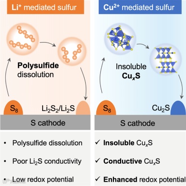 锂硫(Li–S)电池因硫正极具有极高的理论比容量,被认为是下一代高能量密度储能体系的重要候选。然而,其实际应用长期受到几大核心瓶颈制约:一是反应过程中生成的多硫化物中间体易溶于电解液并发生穿梭,导致容量快速衰减;二是放电终产物Li2S导电性极差,限制了反应动力学;另一方面,硫/多硫化物反应体系本征电位较低,锂硫电池放电平台电压约为2.1V。现有研究主要通过物理限域或界面调控等手段,在电池内部抑制多硫化物的溶解与迁移,但这些策略并未从根本上改变硫电极的反应路径。针对这一问题,本文重新设计硫电极反应中的电荷载体,从反应源头避免可溶性多硫化物的生成。
