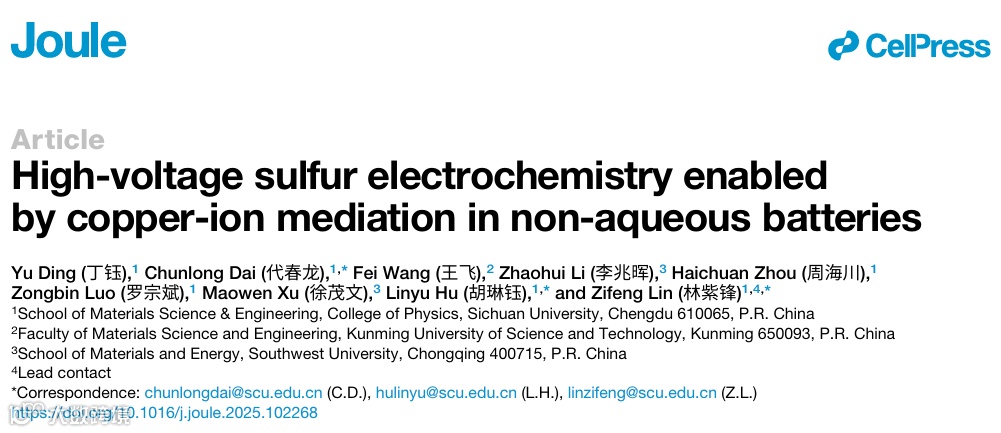 近日,四川大学林紫锋、代春龙、胡琳钰团队在Joule上发表研究论文“High-voltage sulfur electrochemistry enabled by copper-ion mediation in non-aqueous batteries”。该研究提出并验证了一种铜离子(Cu2+)介导的非水系硫电化学新体系,以Cu2+ 取代传统碱金属离子(Li+/Na+/K+)作为硫电极反应的电荷载体,从根本上突破了传统硫基电池在反应机理层面的固有限制。研究表明,在有机电解液中,硫在 Cu2+ 参与下主要经历固相硫化铜(CuxS)中间体的多步转化过程。由于 CuxS 在有机溶剂中溶解度极低,该体系在本征上抑制了多硫化物的溶解与穿梭问题。同时,铜离子介导的硫电化学反应显著提高了硫的氧化还原电位,整体提升幅度超过 1.2 V。基于这一新机制,研究团队进一步构建了放电电压高达 3.3 V的锂–硫混合全电池,为发展高电压、高能量密度硫基储能体系开辟了全新的技术路径。