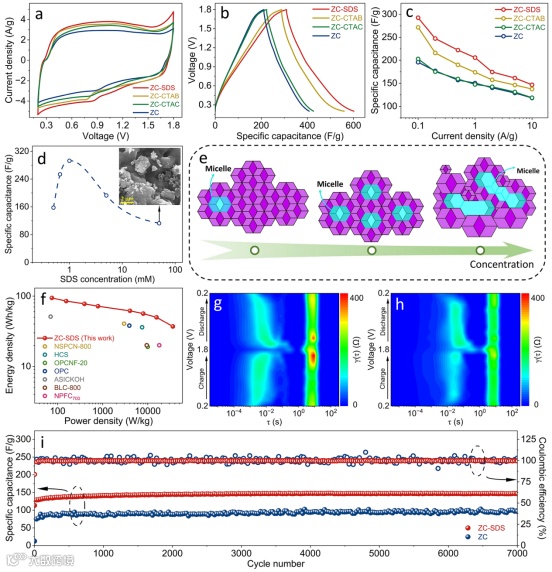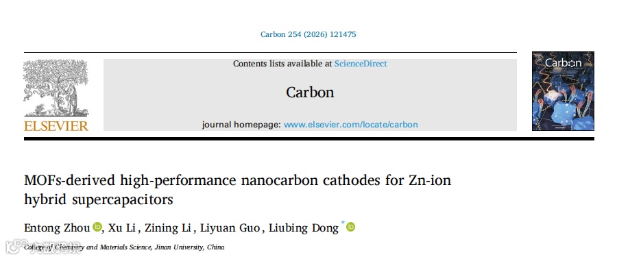 近日,暨南大学董留兵教授团队在国际知名期刊Carbon上发表题为“MOFs-Derived High-Performance Nanocarbon Cathodes for Zn-Ion Hybrid Supercapacitors”的研究论文。该工作使用表面活性剂对ZIF-8 MOF衍生碳进行改性,实现更优异的离子存储性能。研究表明,在适当浓度下,特定表面活性剂会形成纳米级胶束,通过静电作用诱导ZIF-8在其周围组装,从而形成表面活性剂胶束嵌在内部的ZIF-8前驱体。在随后的高温热解过程中,ZIF-8骨架分解形成微孔,同时嵌入的表面活性剂胶束转化为均一的介孔及杂原子位点,从而制备出ZIF-8衍生的纳米碳材料。值得一提的是,SDS表面活性剂调控的ZIF-8前驱体材料能够进一步碳化为具有分级多孔结构和丰富N/O/S杂原子的高比表面积纳米碳材料。在ZHS中,SDS调制的ZIF-8衍生纳米碳正极(ZC-SDS)表现出显著提高的比电容、优异的倍率性能和良好的循环稳定性。实验分析和理论计算表明,ZC-SDS通过以电容过程为主的机制存储电荷,其分级多孔结构与丰富的杂原子位点共同促进了高容量和快速离子存储。
