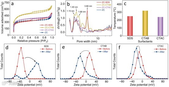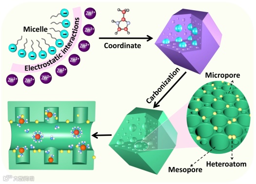 ZIF-8是具有沸石拓扑结构的代表性MOF。其凭借高含氮量和高比表面积被视为制备多孔碳材料的优良前驱体。然而,受限于ZIF-8相对较小的孔径以及高温碳化过程中不可控的结构坍塌,ZIF-8衍生碳的碳孔结构与大尺寸水合锌离子不适配,这严重限制了ZIF-8 MOF在锌基储能领域的应用。本工作通过引入表面活性剂对ZIF-8 MOF衍生碳材料进行改性。在前驱体合成过程中,表面活性剂自组装形成纳米级胶束,通过静电相互作用诱导ZIF-8在其周围组装,形成胶束被嵌在ZIF-8内部的前驱体材料。在随后的高温碳化过程中,ZIF-8骨架分解生成微孔,同时嵌入的表面活性剂胶束转变为均匀的介孔和杂原子位点,最终得到微孔和介孔兼具的分级多孔ZIF-8衍生碳。