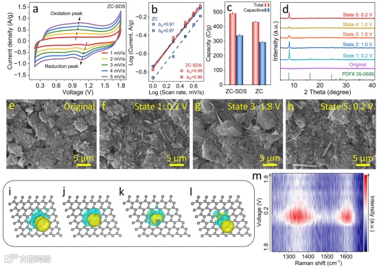 为研究MOF衍生碳正极的电化学动力学,对衍生碳材料的变扫速循环伏安法进行了拟合分析。结构表明MOF衍生碳正极具有以电容为主的电荷存储机制,同时计算表明,ZC-SDS正极材料具有更出色的电荷存储能力和更快速的电化学反应动力学。进一步通过pH动态监测及原位拉曼等策略阐明MOF衍生碳正极在ZHS中的电荷储存机制,结果表明MOF衍生碳正极通过离子吸附/脱附的机制进行电荷存储,这与以往许多文献报道的结果一致。除此以外,通过分析不同充放电状态下的XPS光谱揭示衍生碳材料中杂原子的赝电容储能机理,进一步证实了杂原子掺杂对于提升碳材料比容量的重要作用。