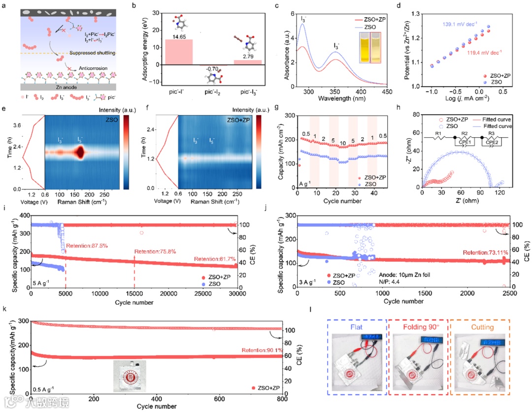 图6. a) 抑制聚碘化合物穿梭的示意图。使用 ZSO 和 ZSO + ZP 电解液的Zn||I2全电池:b) 吸附能,c) UV-vis光谱,d) CV曲线的塔菲尔图(氧化过程)。e) ZSO 和f) ZSO+ZP 在Zn−I2电池中的原位拉曼光谱。g) 在0.5、1、2、5和10 A g–1电流密度下的速率性能测试,h) 尼奎斯特图。i) 使用 ZSO 和 ZSO + ZP 电解液的Zn||I2全电池在5 A g–1电流密度下的长期循环性能。j) 低N/P比下Zn||I2全电池在3 A g–1电流密度下的循环性能。k) 使用 ZSO+ZP 电解液的Zn||I2袋式电池在0.5 A g–1电流密度下的循环性能。l) 由 ZSO+ZP 电解液的Zn||I2全电池供电的LED灯。