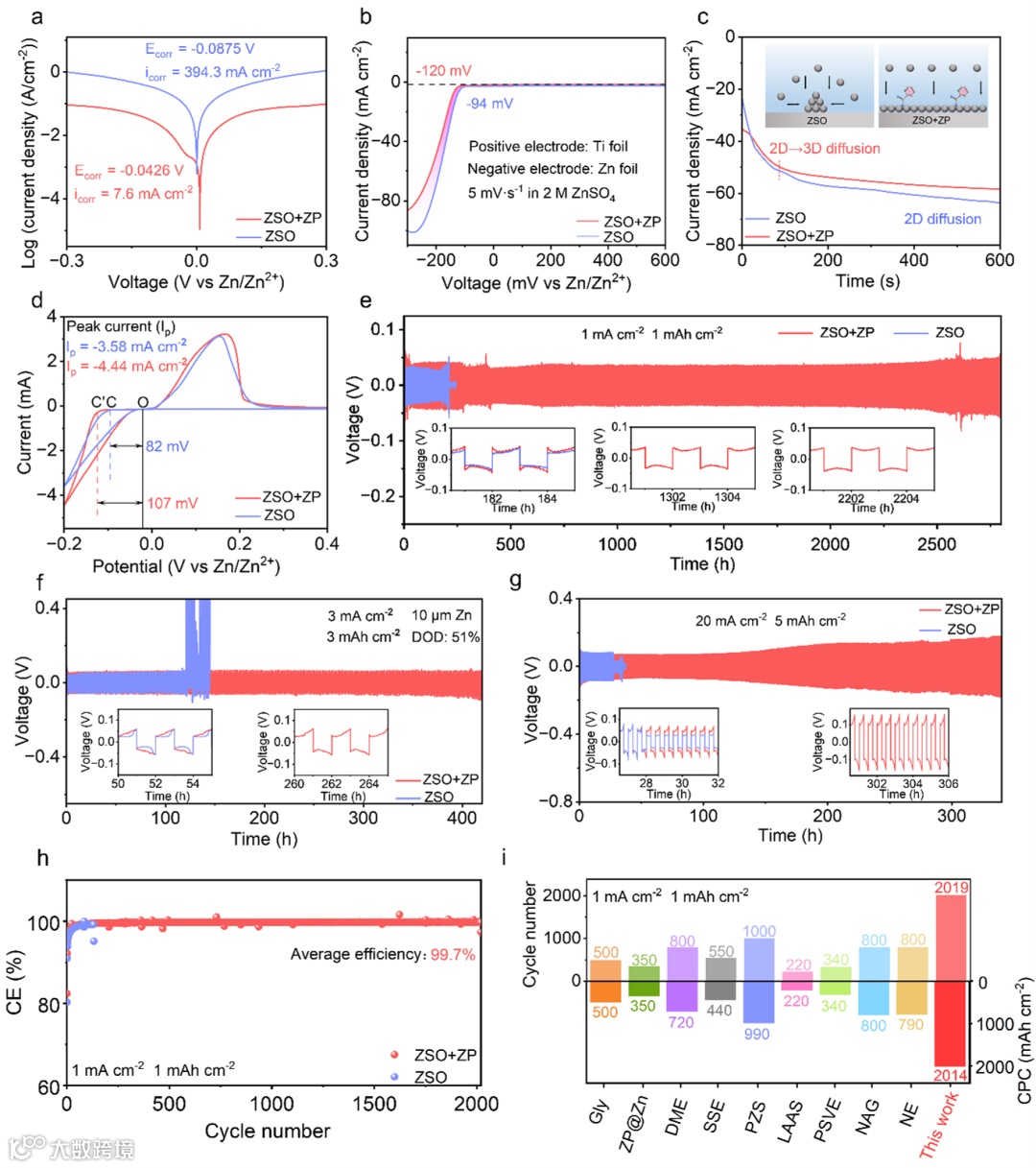 图3. ZSO 和 ZSO+ZP 电解质:a) Tafel曲线,b) Zn||Ti电池的LSV曲线,c) 固定电位模式下的CA曲线,d) Zn||Ti半电池的CV测试,e-g) Zn||Zn对称电池的长循环性能,h) Zn||Cu半电池的CE测试。i) Zn||Cu半电池在不同电流密度和面积容量下的CPC与其他研究的对比。