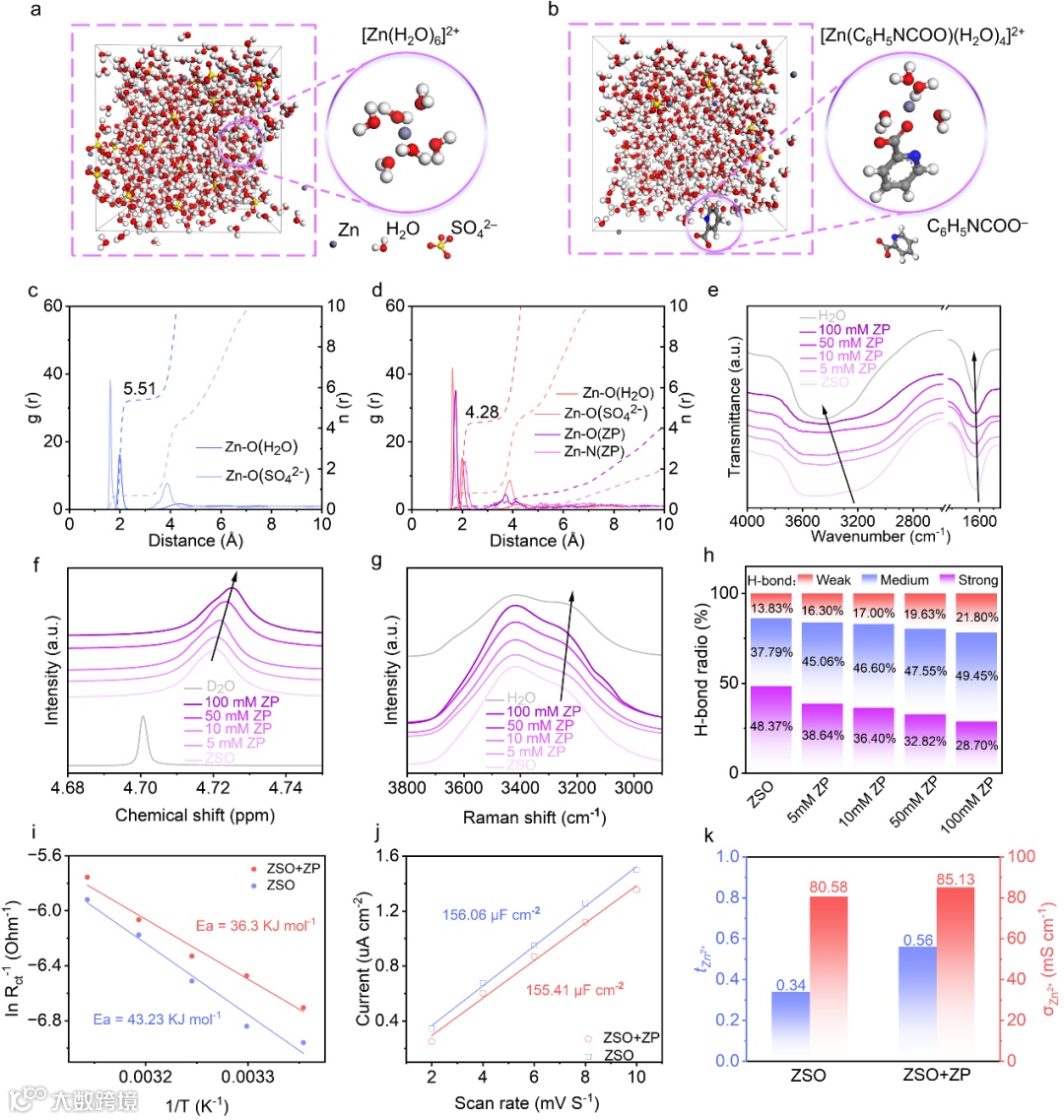 图2. 分子动力学模拟及主要溶剂化结构 a) ZSO 和 b) ZSO+ZP 电解质。c) ZSO 电解质中 Zn–O(H2O), Zn–O(SO42–) 和 d) ZSO+ZP电解质中Zn–O(H2O), Zn–O(SO42–), Zn–O(ZP) 和 Zn–N(ZP) 的RDFs。ZSO, 5 mM ZP, 10 mM ZP, 50 mM ZP, 100 mM ZP 及 H2O/D2O的 e) FTIR, f) NMR 和 g) Raman 光谱。 h) 强、中、弱氢键的比例。i) Ea ,j) EDLC ,以及k) ZSO 和 ZSO + ZP 电解质的Zn2+转移数和离子电导率。