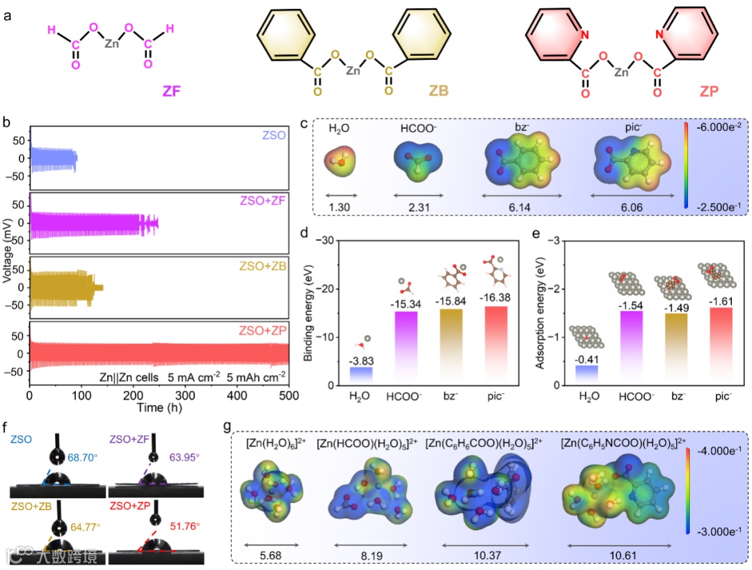 图1. a) ZF 、 ZB 和 ZP 分子的空间构型。b) Zn||Zn电池在2 M ZnSO4(ZSO)、 ZSO +10 mM ZF(ZSO + ZF)、 ZSO +10 mM ZB(ZSO + ZB)和 ZSO +10 mM ZP(ZSO + ZP)中的循环性能,电流密度为5 mA cm–2和5 mAh cm–2。c) ESP映射。d) 结合能与相互作用行为。e) 水、 HCOO–、bz– 和pic– 在Zn(002)晶面上的吸附能。f) 不同添加剂在Zn箔上 ZSO 和 ZSO 的接触角测量。g) ESP映射及 ZSO 、 ZSO + ZF 、 ZSO + ZB 和 ZSO + ZP 中溶剂化结构的直径。