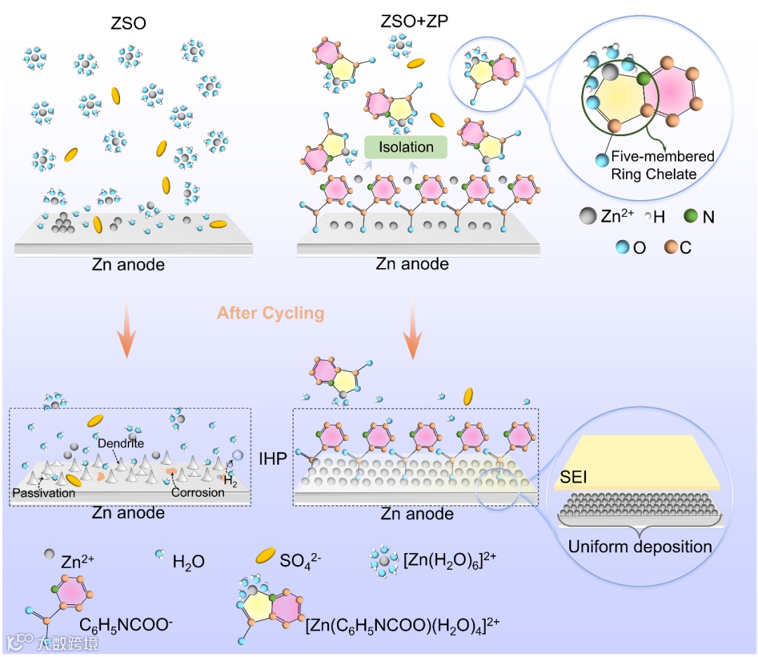 示意图1. Zn箔在 ZSO 和 ZSO + ZP 电解液中的沉积行为。