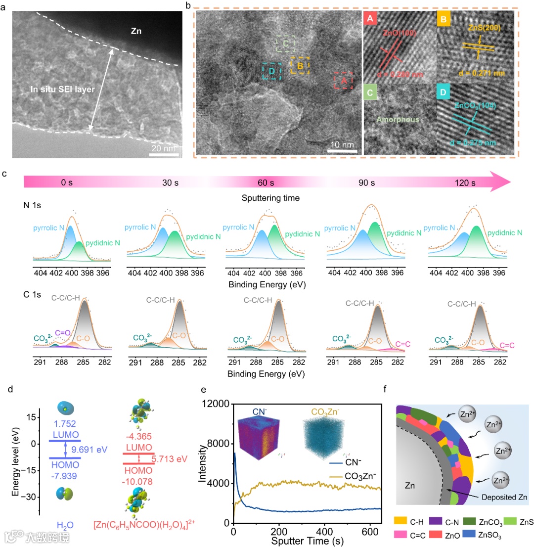 图4. a) TEM和b) HRTEM 图像显示在 ZSO+ZP 电解液中于Zn箔上以10 mA cm–2和1 mAh cm–2电流密度循环50次后形成的SEI。c) XPS 谱显示在 ZSO + ZP 电解液中以10 mA cm–2和1 mAh cm–2电流密度循环50次后,通过Ar溅射在Zn箔上0至120秒期间的N 1s和C 1s能级。d) 水和[Zn(C6H5NCOO)(H2O)4]2+ 的 LUMO 和HOMO能级。e) 3D空间分布及3D等高线曲线显示在10 mA cm–2和1 mAh cm–2电流密度下循环50次后通过ToF-SIMS形成的SEI组分。f) ZSO + ZP 电解液循环后形成的混合SEI层与沉积Zn的示意图。