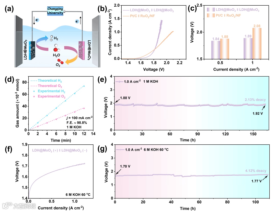 图5.(a)两电极电解槽的示意图,(b)LSV曲线,(c)在0.5 和 1.0 A cm-2处水电解性能比较,(d)法拉第效率测试,(e)和(g)LDH@MoO3的计时电位曲线,(f)LDH@MoO3在AEM电解池中的极化曲线,在6.0 M KOH中,60°C,无iR补偿。