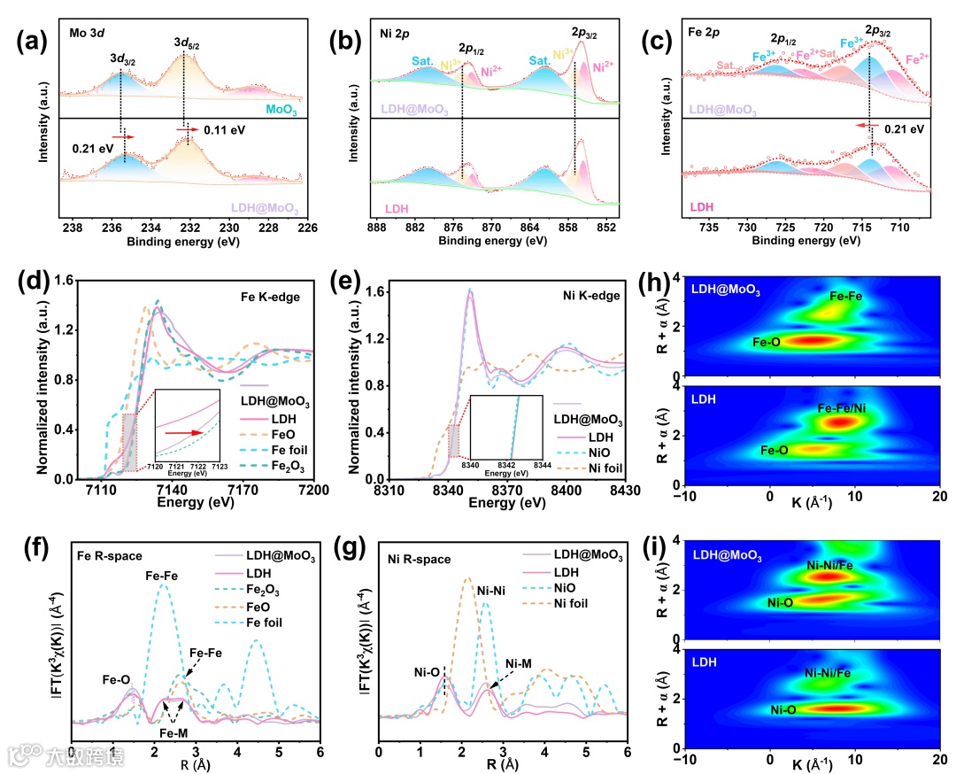 图3. 高分辨率(a)Mo 3d,(b)Ni 2p,(c)Fe 2p XPS光谱.(d)Fe K边和(e)Ni K边的XANES光谱.(f)Fe K-边(g)Ni-K边的EXAFS。(h)Fe K-边和(i)Ni K-边的小波变换。