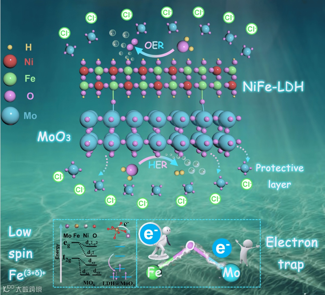 近日,来自重庆大学的韩晓彤副教授和胡宝山副教授,东北电力大学的张坤副教授和北京化工大学的邱介山教授合作,在能源催化领域国际知名期刊Applied Catalysis B: Environment and Energy上发表了题为“通过电子陷阱工程调控铁自旋态以实现高效工业淡水/海水电解”的研究成果。该研究设计了一种异质结构双功能催化剂LDH@MoO3,通过界面电子调控(Mo6+作为电子捕获剂)诱导形成高价态低自旋构型Fe(3+δ)+物种(t2g(5-δ) eg0),同时利用表面原位生成的MoO42-静电防护层抵抗Cl-对电极的腐蚀从而提升海水电解稳定性,为设计自旋依赖型双功能电解水催化剂用于工业级电流密度下海水电解制氢提供了新策略。