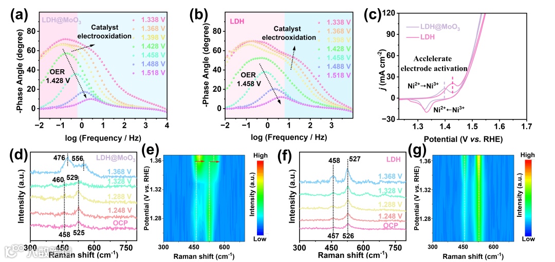 图7. (a)LDH@MoO3和(b)LDH的原位Bode图以及(c)CV曲线。(d)和(e)LDH@MoO3的原位拉曼光谱。(f)和(g)LDH的原位拉曼光谱。