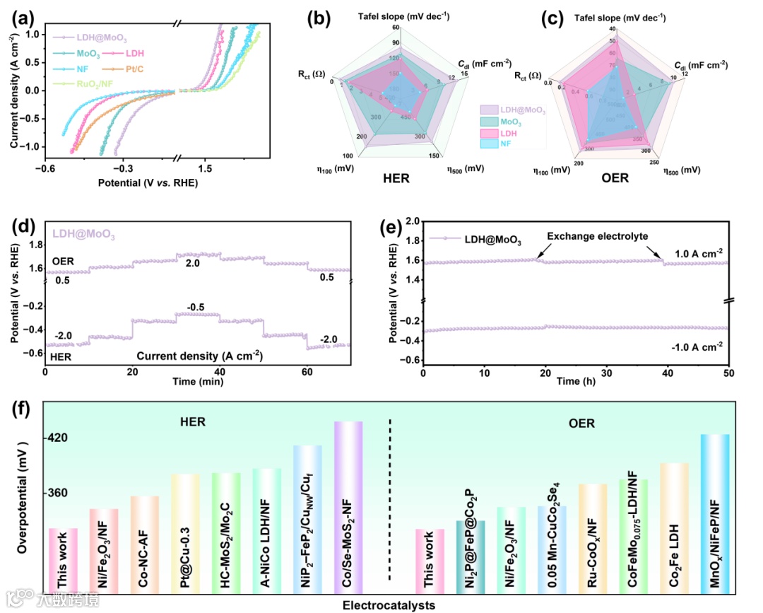 图4.(a)LDH@MoO3的HER和OER极化曲线,全面比较了LDH@MoO3与对比样品的(b)HER与(c)OER性能,LDH@MoO3的(d)HER和(e)OER的多步计时电位曲线,(f)在1 A cm–2的电流密度下LDH@MoO3与文献报道的催化剂性能的比较。