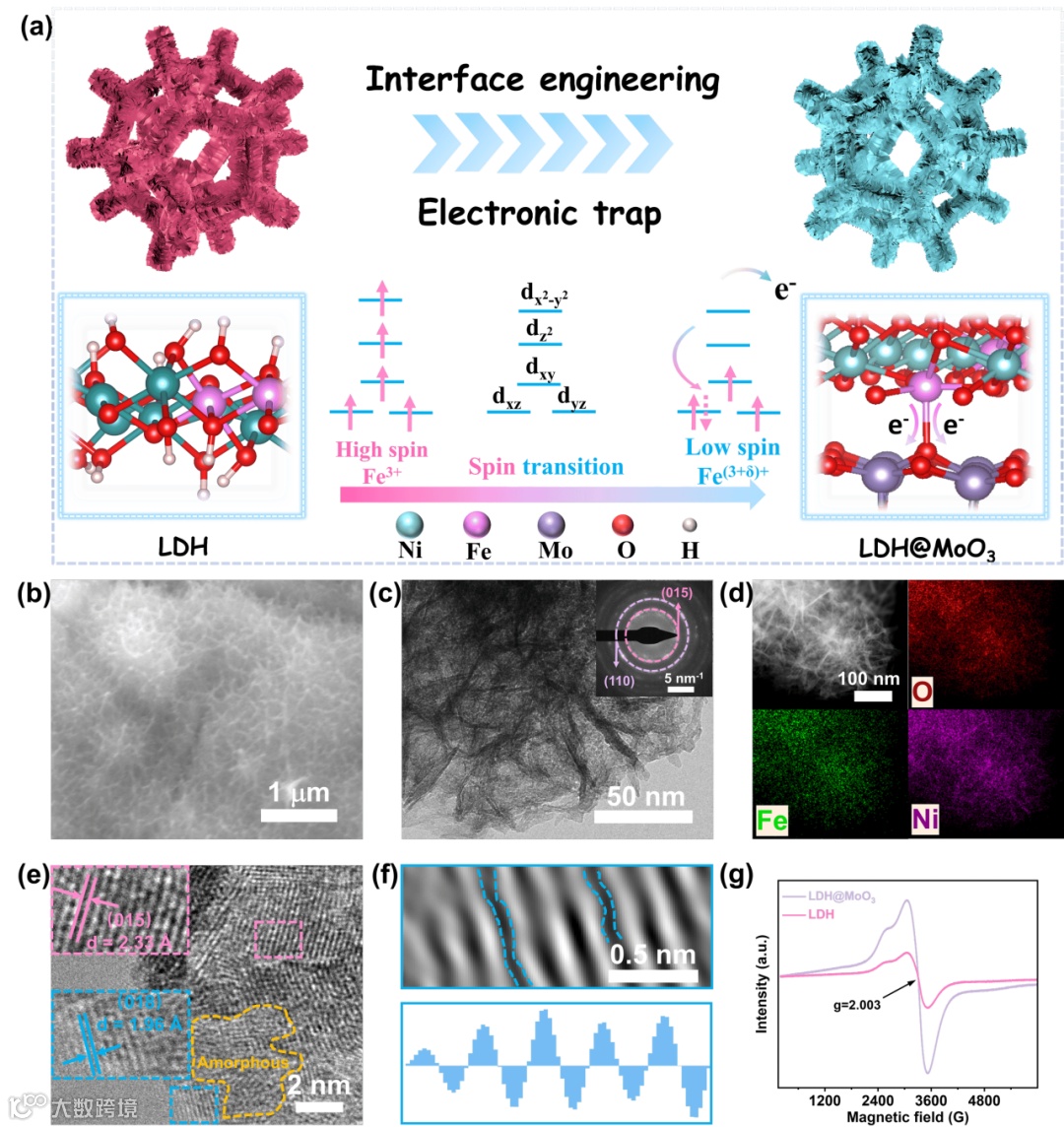 通过简单的一步水热法成功合成了具有低自旋铁位点的异质结构双功能电催化剂LDH@MoO3(见图1a)。具有垂直交联结构的超薄的NiFe-LDH纳米片网络显著增加了电化学活性表面积,还提供了丰富的间隙通道,促进电解质快速渗透和高效气泡脱附,从而提升质量传递效率。EDS元素映射谱进一步验证了镍、铁和氧在LDH@MoO3中的均匀分布。LDH@MoO3的高分辨率TEM(HRTEM)图像显示了具有不同取向的晶体表面。间距为0.233 nm的晶格,来源于NiFe-LDH的(015)晶面。此外,0.196 nm的晶格间距,源自NiFe-LDH的(018)晶面。LDH@MoO3的EPR光谱在g=2.003处信号增强,表明材料中存在丰富的氧空位,有利于提升本征活性和电荷传输。