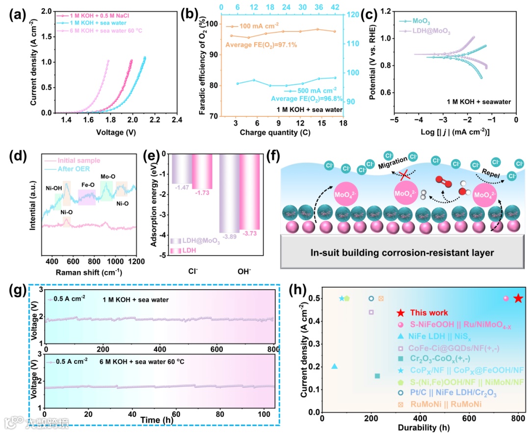 图6.(a)LDH@MoO3的LSV曲线在不同电解质中,未进行iR补偿,(b)法拉第效率,(c)LDH@MoO3和MoO3的动电位极化曲线,(d)LDH@MoO3在OER反应前后的拉曼光谱,(e)LDH@MoO3和LDH对于Cl-和OH-的吸附能,(f)LDH@MoO3的耐腐蚀机制示意图,(g)LDH@MoO3的在碱性海水中的稳定性测试曲线,(h)LDH@MoO3的耐久性与文献中已报道催化剂的比较。