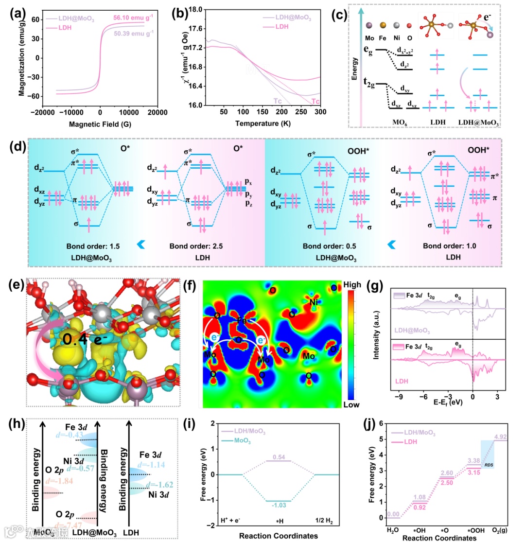 图8.(a)磁滞曲线和(b)LDH@MoO3的温度依赖的磁化率,(c)LDH@MoO3和LDH中Fe的d轨道电子排布示意图,(d)中间体与Fe的d轨道相互作用的示意图,(e)差分电荷密度,(f)LDH@MoO3的二维差分电荷密度图,(g)LDH@MoO3的DOS曲线,(h)计算不同原子的p波段和d波段中心,(i)HER和(j)LDH@MoO3的吉布斯自由能图。