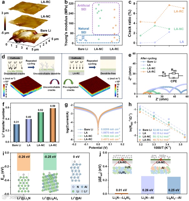图4. 微观/介观尺度下的电化学分析及理论计算。a)AFM。b)杨氏模量。c)裂纹率。d)Li+浓度有限元分析及沉积示意图。e)循环后的Nyquist图。f)Li+转移数。g)Tafel及对应的交换电流密度。h)活化能。i)第一性原理计算Li3N、Li9Al4和Al对Li+的吸附能Ead。j)Li+在不同组分间的传输能垒。