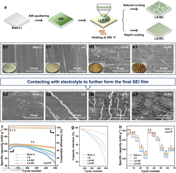 首先,通过磁控溅射AlN在Li表面构建初始的人工SEI膜,再通过调控退火过程的降温速率来调控SEI膜层中的裂纹状态。其中,快速的降温过程由于较大的相变应力和膨胀系数差异有利于形成均匀的微裂纹网络结构(LA-RC,图2a)。与Bare Li的致密表面(图2b1)相比,LA(图2c1)和LA-NC(图2d1)呈现出长条形的裂纹,而LA-RC表面则由均匀的微米级方形网络构成(图2e1),证实了有序微裂纹网络结构的成功构建。电池组装后,裂纹会被电解液浸润并被新鲜的SEI膜填充,最终形成完整且稳定的 SEI膜(图2c2–e2)。Li||LFP全电池长循环和倍率数据表明,微裂纹网络结构对电化学性能具有明显的正向调控作用(图2f–h)。