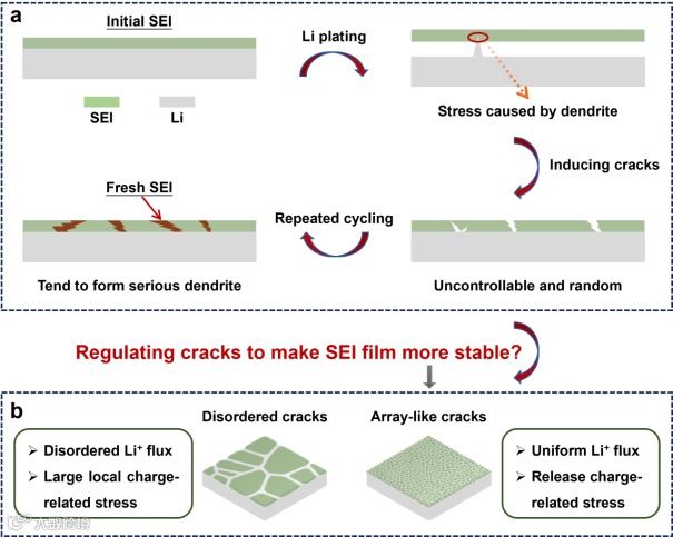 图1. 调控SEI膜裂纹抑制枝晶的示意图。a)不可控的SEI开裂。b)构建阵列状微裂纹实现SEI膜的稳定化。