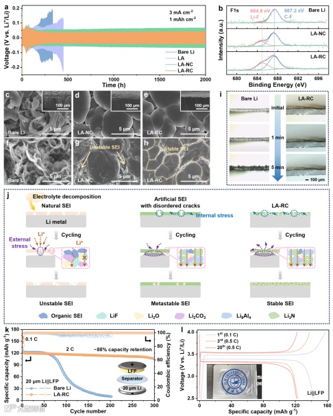 图5. LA-RC的电化学性能和沉积/剥离行为。a)对称电池在3 mA cm–2 & 1 mAh cm–2下的循环性能。b)Ar离子刻蚀后F1s的XPS光谱。c–e)沉积态和f–h)剥离态SEM。i)可视电池原位观测Li沉积行为。j)不同SEI膜对Li金属负极的作用机制示意图。k)20 μm Li||LFP在2 C下的长循环性能。l)Li||LFP软包电池的恒流充/放电曲线。