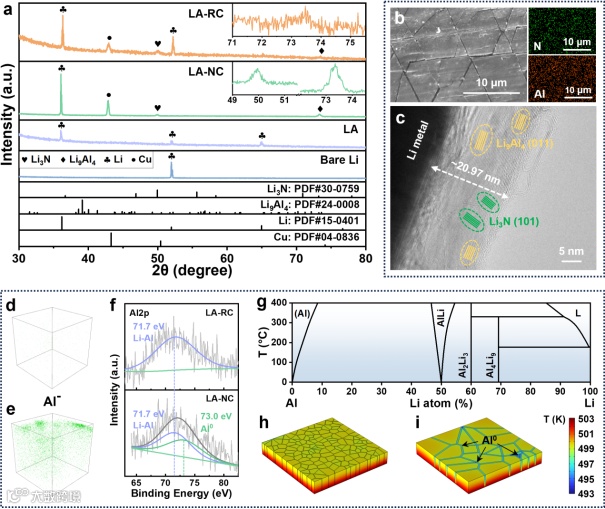 图3. LA-RC的组分和形貌分析。a)XRD。b)表面形貌SEM及对应的EDS。c)TEM。d)LA-RC和e)LA-NC中Al–的三维ToF-SIMS映射图像。f)Al2p的XPS光谱。g)Li–Al相图。h)LA-RC和e)LA-NC的表面热分布。