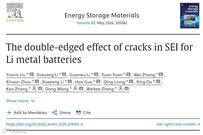 近日,吉林大学郑伟涛教授、王东研究员、张侃教授、及刘玉敏博士等人跳出“规避裂纹”的传统设计思路——以“破”为“立”,通过精准调控SEI膜的内外应力,构建有序的微裂纹网络结构,将制约性能的结构缺陷转化为提升电池性能的核心功能优势,为Li金属负极的稳定化提供了新思路!