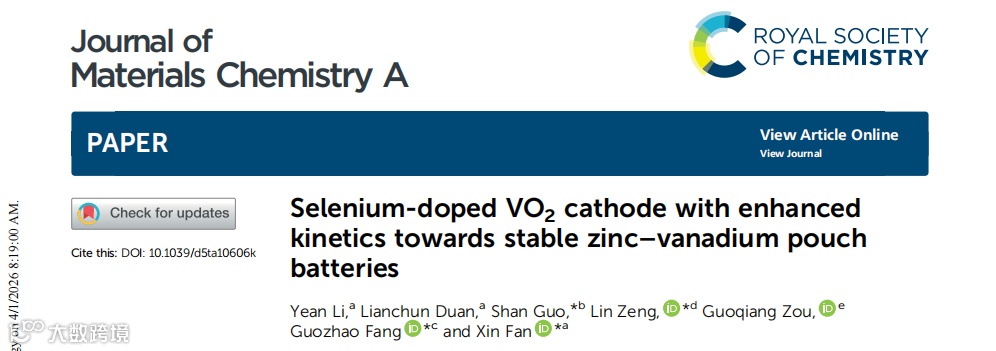 近日,来自桂林理工大学樊新教授与中南大学方国赵教授等人合作,在国际知名期刊Journal of Materials Chemistry A上发表了题为“Selenium-doped VO2 cathode with enhanced kinetics towards stable zinc-vanadium pouch batteries”的重要研究成果。