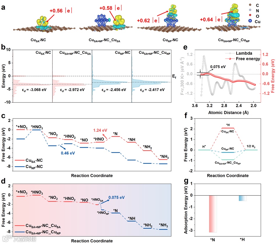 图6. a) The charge difference mappings of CuSA-NC, CuNP-NC, and CuSA and CuNP in CuSA+NP-NC adsorbed with *NO3, the aggregation and depletion of the electron cloud were represented in yellow and green, respectively. b) The PDOS of the Cu-3d orbital for CuSA-NC, CuSA in CuSA+NP-NC, CuNP-NC, and CuNP in CuSA+NP-NC adsorbed with *NO3. c) Free-energy diagrams of NO3RR on CuSA-NC and CuNP-NC. d) Free-energy diagrams of NO3RR on the CuSA site and CuNP site in CuSA+NP-NC. e) Free energy diagram of *HNO during transfer from Cu single atom to the surface of Cu nanoparticle. f) Free energy of the H2 formation on three models. g) The adsorption energies of the intermediates *N and *H on the CuNP site in CuSA+NP-NC.