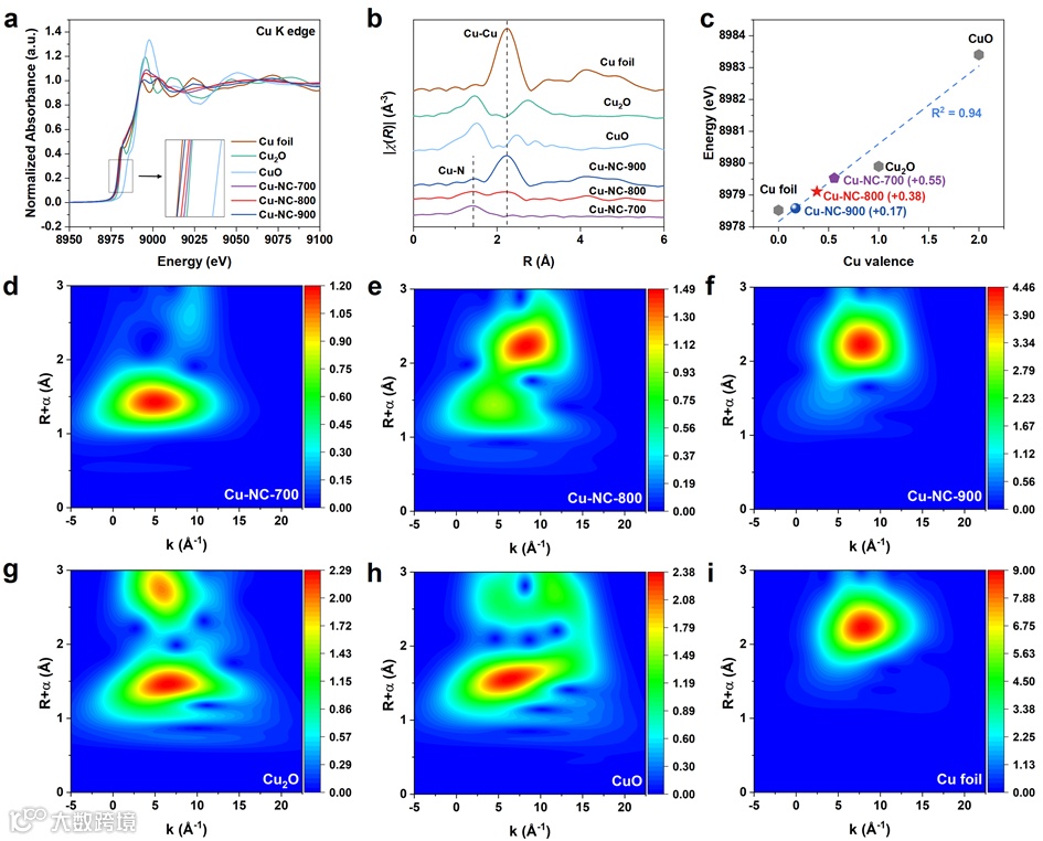 图3. a) Normalized XANES spectra, and b) EXAFS spectra of Cu-NC-700, Cu-NC-800, Cu-NC-900 and reference samples. c) Linear fit of Cu valence versus Cu K-edge energy position. d-i) WT for the k3-weighted Cu K-edge EXAFS signals of Cu-NC-700, Cu-NC-800, Cu-NC-900 and reference samples。