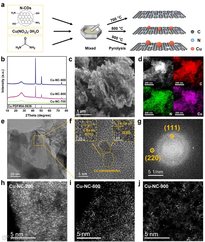 图2. a) Schematic illustrations of the synthesis of Cu-NC-800. b) XRD analysis of Cu-NC-700, Cu-NC-800, and Cu-NC-900. c) SEM images of Cu-NC-800. d) EDS mapping of Cu-NC-800. e-f) HRTEM images of Cu-NC-800. g) The fast Fourier transform (FFT) pattern of Cu-NC-800. h-j) HAADF-STEM images of Cu-NC-700, Cu-NC-800, and Cu-NC-900。