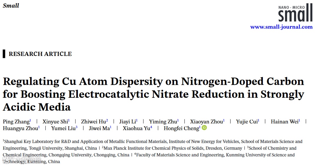 近日,来自同济大学的程洪飞特聘研究员与昆明理工大学的于晓华副教授合作,在国际知名期刊Small上发表题为“Regulating Cu Atom Dispersity on Nitrogen-Doped Carbon for Boosting Electrocatalytic Nitrate Reduction in Strongly Acidic Media”的研究论文。该论文通过调控热解温度合成了一系列具有不同Cu原子聚集态的碳载Cu基催化剂,用于探究不同聚集态Cu物种在酸性NO3RR反应中的催化作用。研究发现共存的Cu单原子和纳米颗粒可以形成两步接力催化机制,同时Cu纳米颗粒与邻近单原子之间的相互作用可以优化关键反应中间体吸附行为,从而有效降低 NO3RR的反应能垒,并抑制竞争性析氢副反应。该研究揭示了单原子与纳米颗粒间的协同效应在促进串联催化中的关键作用,为理性设计高效酸性NO3RR电催化剂提供了新的思路与参考。