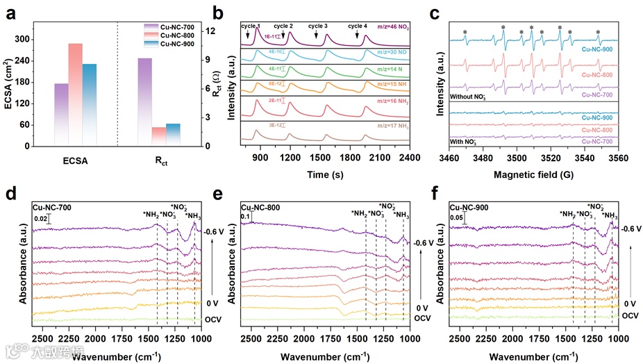 图5. a) ECSA and Rct of Cu-NC-700, Cu-NC-800, and Cu-NC-900. b) The DEMS measurements of Cu-NC-800 during NO3RR. c) The DMPO-involved operando EPR spectra of Cu-NC-700, Cu-NC-800, and Cu-NC-900 in 0.5 M H2SO4 with and without 0.5 M NO3− at −0.3 V vs. RHE. d-f) In-situ FTIR spectra of three samples in the range of 0 to −0.6 V vs. RHE